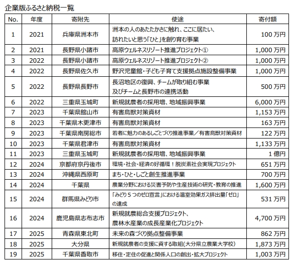 渡辺パイプは「地域と共生プロジェクト」を通じて、企業版ふるさと納税の制度を積極的に活用し、これまで下記表の通り、各自治体に寄附いたしました。今後もよりよい社会づくりへの貢献を続けてまいります。