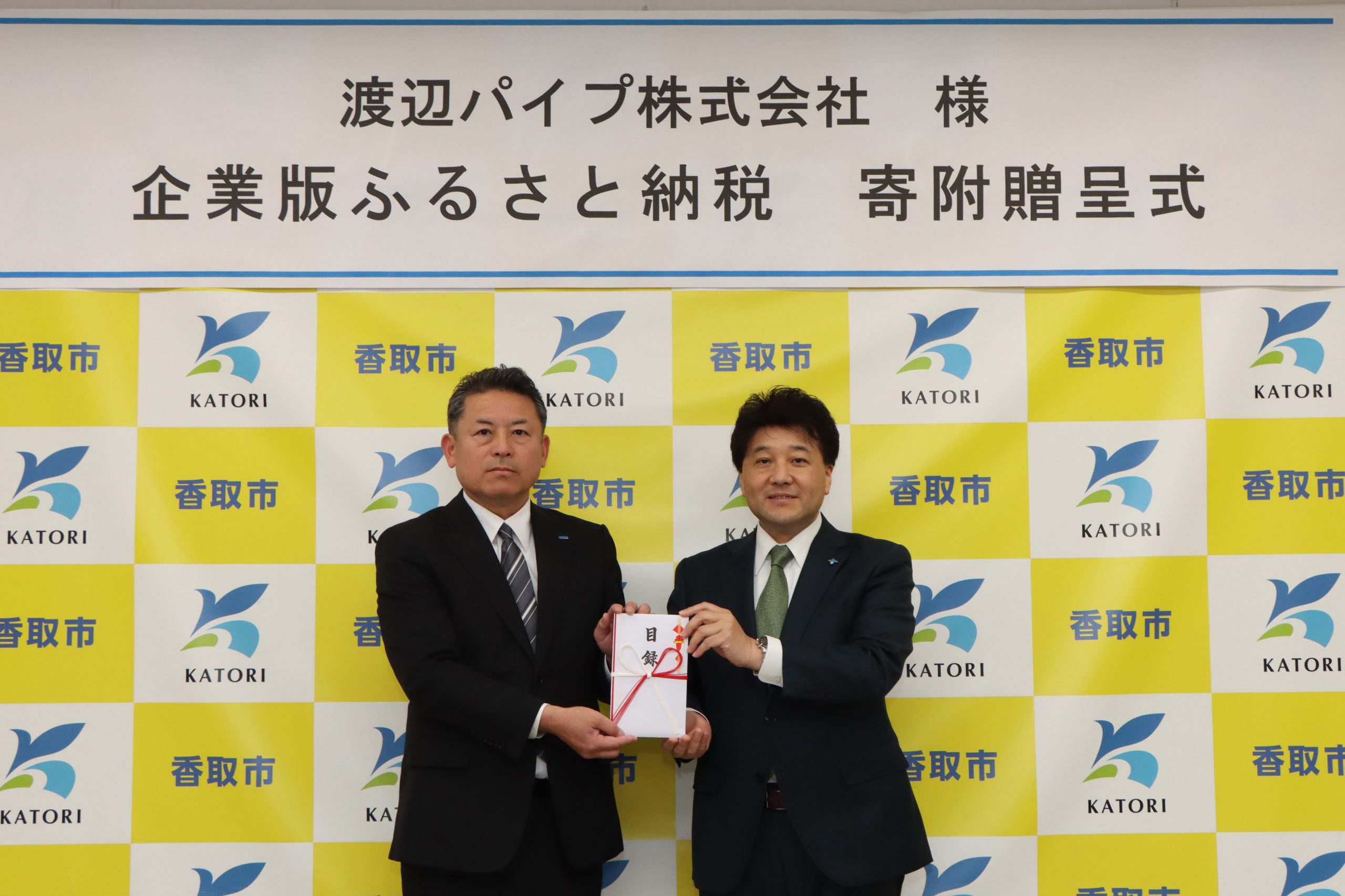 ▲ 左)渡辺パイプ 千葉サービスセンター 所長 中川 英明 、 右)香取市 市長 伊藤 友則氏